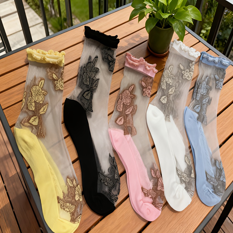 TEMU 여성용 여름용 통기성 아이스 실크 섬유 플로럴 장식 미드캐프 양말 5켤레 - 발수 및 냄새 방지, 패슬 컬러, 러플 탑 디자인, 세탁 가능, 캐주얼 & 포멀 웨어, 귀여운 양말, 우아한 소크