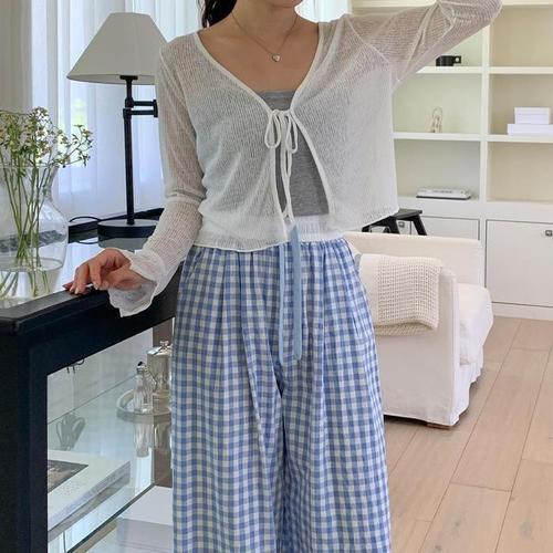 시스루 펀칭 니트 스트링 가디건 여름 긴팔 바캉스룩용 얇은 카디건 루즈핏 여성롱 숏가디건 로브 망사 그