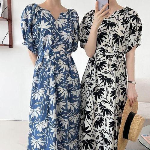 여성 여름 루즈핏 박스핏 브이넥 플라워 면 롱 원피스
