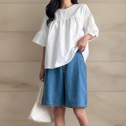 [옷자락] 여성 여름 핀턱 와이드 중청 뒷밴드 버뮤다 청반바지