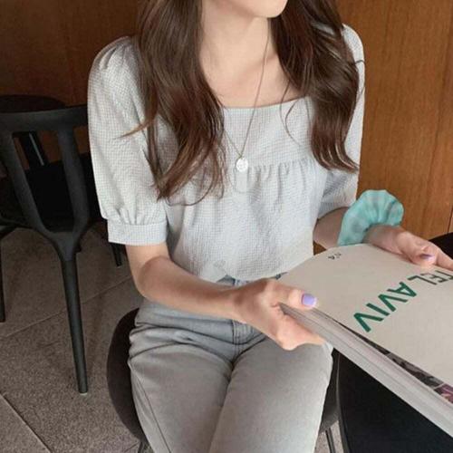 [셀럽하우스]여름 ZMIF0120 블라우스 여성 스퀘어넥 체크 셔링 셔츠 2컬러