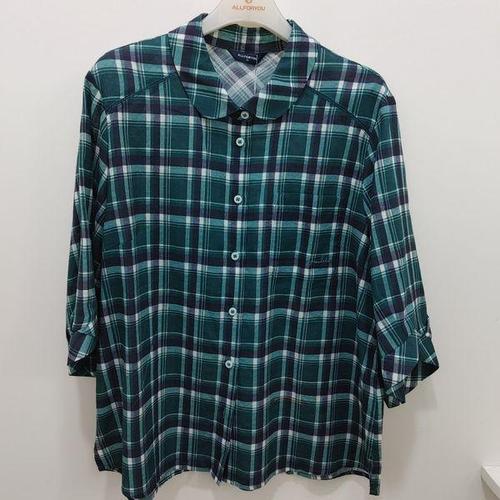 여성용 여름용 빅사이즈 체크 린넨 블라우스 스타일 반팔 셔츠형 라운드넥 캐주얼 상의