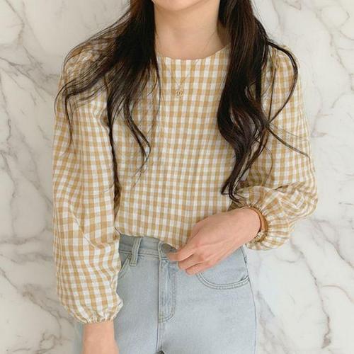 [신상오픈런]여성용 봄 여름 간절기 체크 패턴 벌룬 블라우스