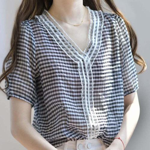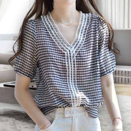 [셀럽하우스]체크 FGQQ8421 브이넥 블라우스 여름 시스루 셔링 통기성 셔츠