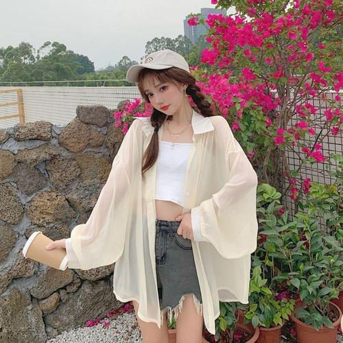 로리에 여성 시스루 셔츠 남방 루즈핏 썸머 긴팔 롱 블라우스 여름 간절기
