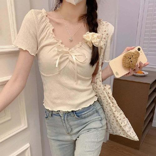 [신상오픈런]여성용 여름 리본 장식 퍼프 소매 크롭 블라우스