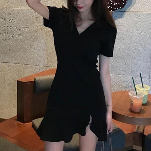 여성 V넥 블랙 트임 미니원피스 프릴 여름 하객룩 WFJGD5U