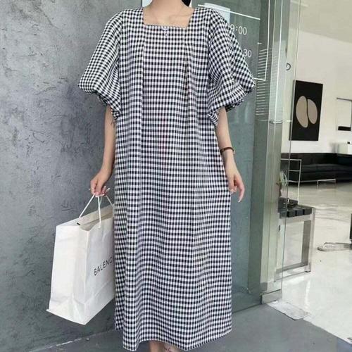[셀럽하우스]여성 YQSO6582 여름 간절기 블랙 카라 잔체크 미디 원피스