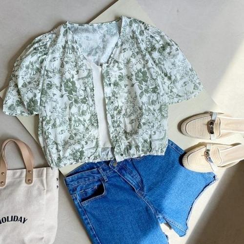[신상오픈런]|CDH2689|쉘헷이 대학생룩 볼륨 여성 블라우스 짧은 썸머 나염_18159267_597559