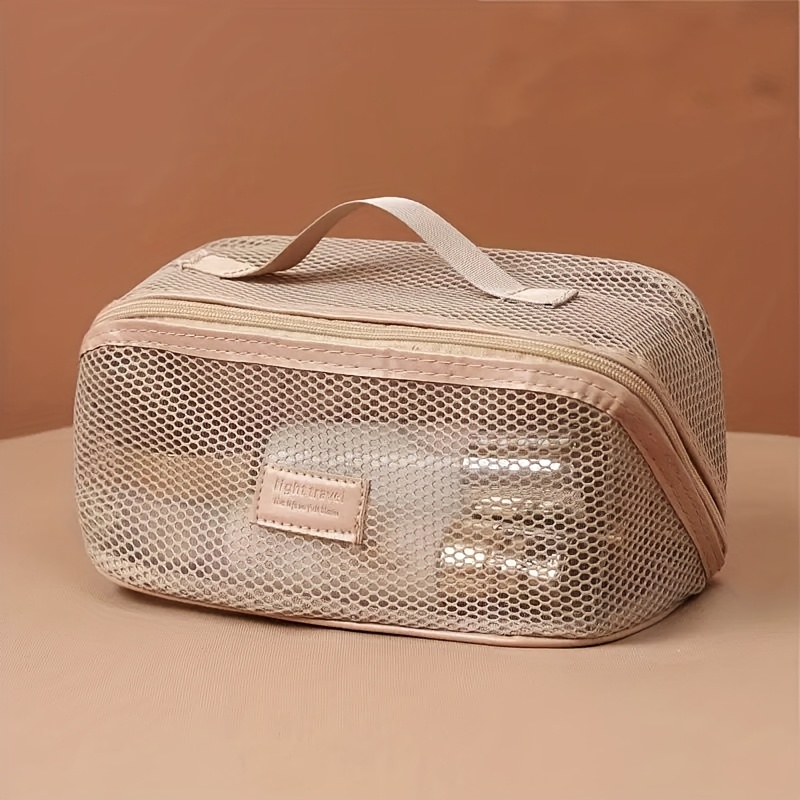 TEMU 1 통기성 메쉬 멀티 컴파트먼트 메이크업 정리함, 휴대용 대용량 경량 여행 화장품 가방, 여성 필수품 | 흰색/핑크/카키 색상, 사계절 사용 가능
