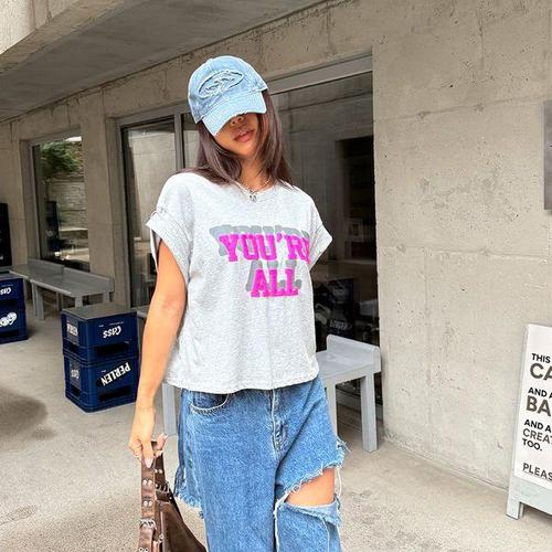 [옷자락]여자 빅레터링 크롭 패치 롤업 캡소매 여름 면 티셔츠