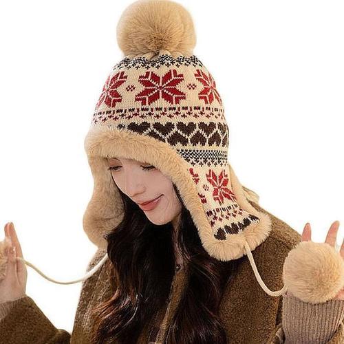 여성 겨울 방한모자 눈꽃 니트 방울 귀달이 안감 퍼 WFFNZR3
