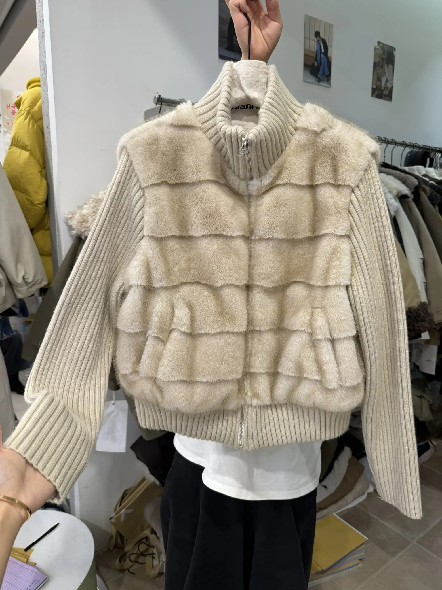 한국 스타일 스탠드 칼라 니트 스플라이싱 플러피 다운 재킷 여성용 숏 신상 겨울 친환경 퍼 탑 따뜻한 두꺼운 여성 코트