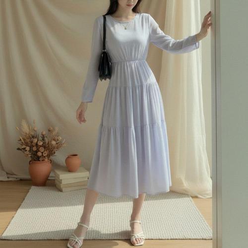 [옷자락] 여성 긴팔 캉캉 허리밴딩 라운드넥 롱드레스