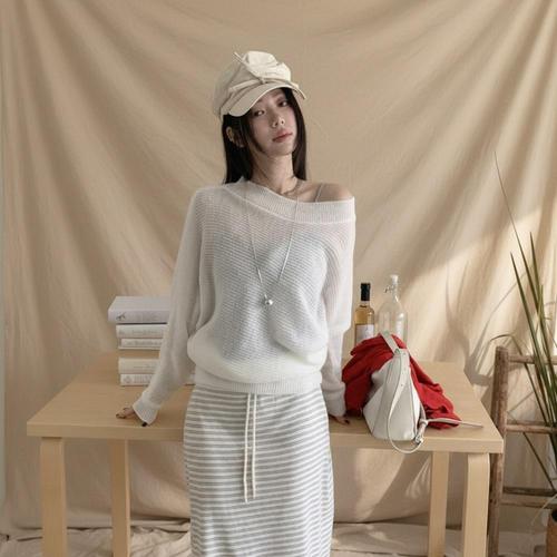[옷자락] 여성 여리핏 와이드넥 가오리 롱슬리브 니트