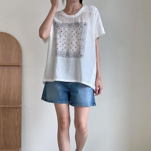 [마쟈]라운드넥 프린트 셔링 언발 린넨 블라우스 티셔츠