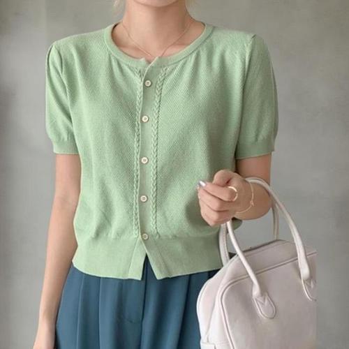 TEMU 프렌치 엘레강스 성격 단색 메탈 버튼 가디건 패셔너블 출퇴근 간편 기본 스웨터 셔츠 봄/여름 캐주얼 반팔 여성용 스웨터 탑 (탑만 해당)