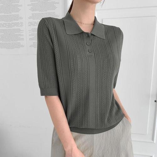 뜨개진 여성용 코튼 스카시 버튼 루피스 카라넥 반팔 니트