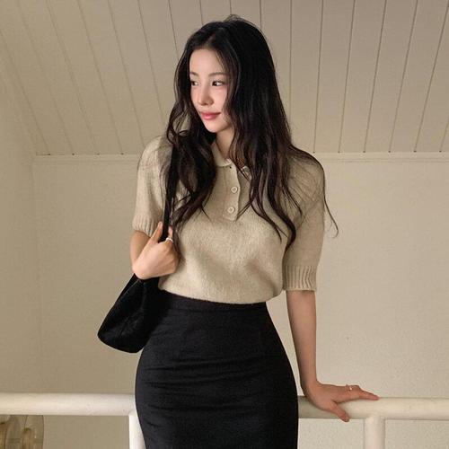 Kdragon 여성 여름 심플 데일리 무지 카라 반팔 니트