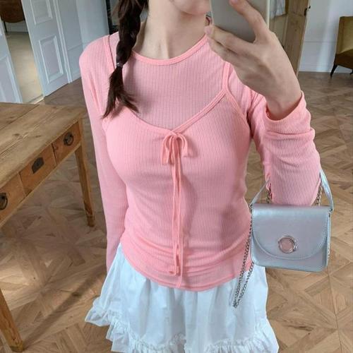 [옷자락]여자 피치 봄티 라운드넥티 발레코어 리본나시 세트