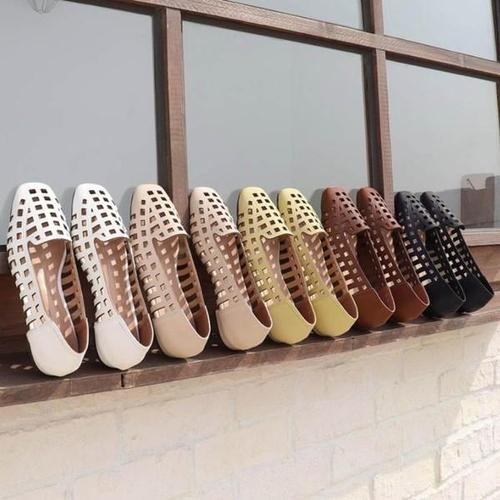 [옷자락]여성 여름 가죽 펀칭 오픈토 통굽 단화 슬립온