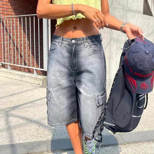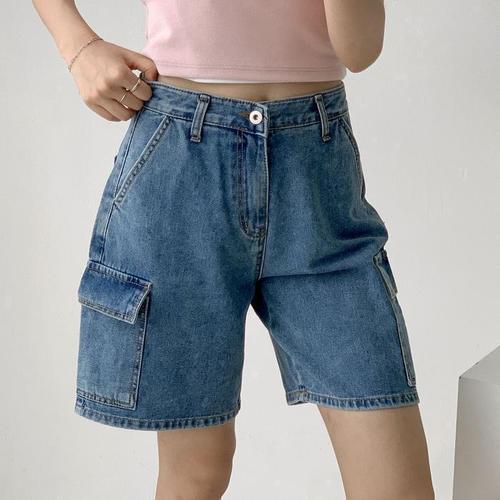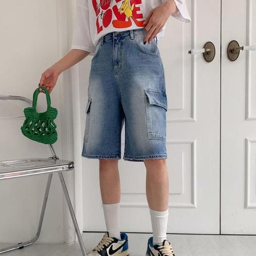 [다잇템]여자 Y2K 워싱 카고데님 넓은 버뮤다 청반바지 (16000969A)