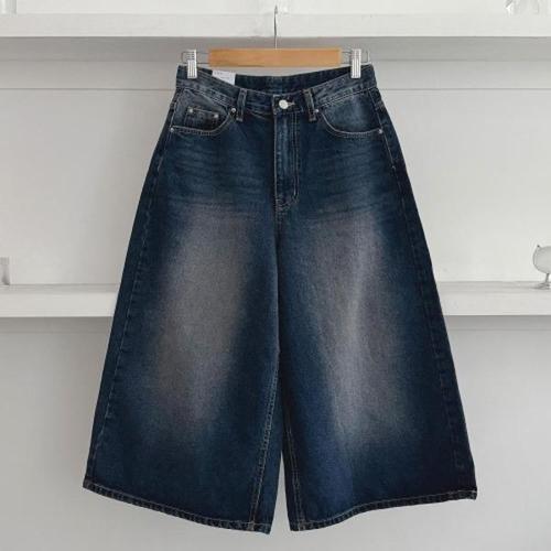 [옷자락] 여자 7부 버뮤다데님 와이드핏 워싱 면 가을 청반바지