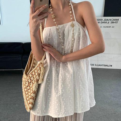 여자 휴가룩 펀칭 꽃무늬 홀터네크 블라우스