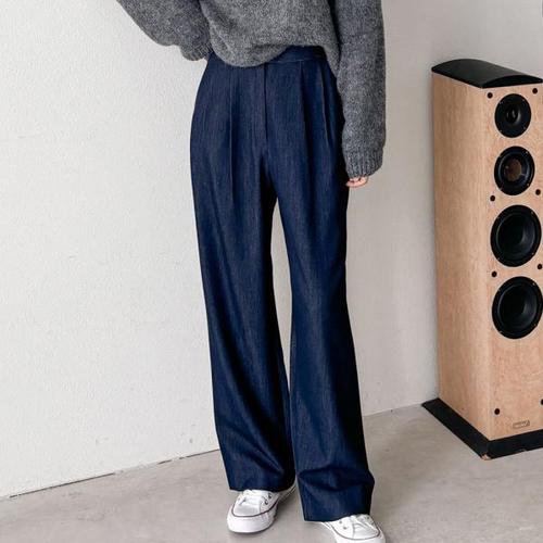 [옷자락]여자 검정데님 롱 파란색 가을데님 고무줄 핀턱와이드 청바지