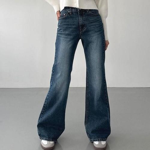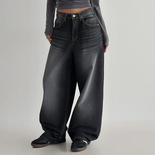 [다잇템]여자 검정 면원단 와이드핏 힙무드 워싱 청바지