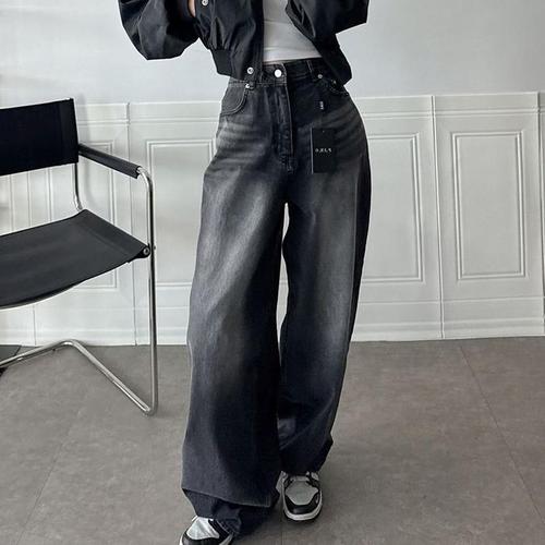 [다잇템_패션]여자 워싱 그런지 검정데님 넓은 SS 청바지