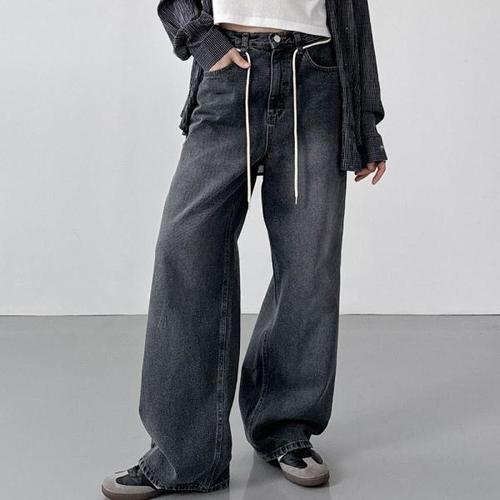 [옷자락]여자 드로우코드 검정데님 그런지 롱 스트릿 워싱 넓은 청바지