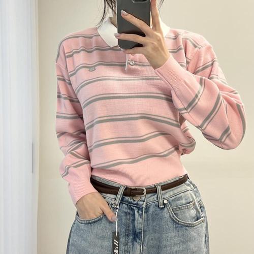 [옷자락]여자 펜던트 배색 카라티 스트라이프 분홍색 니트