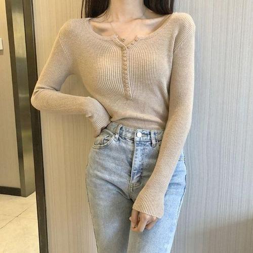 여성용 무지 하프 버튼 앞면 골지 티셔츠, 패션 탑, 캐주얼 핏 긴팔 라운드넥 티셔츠
