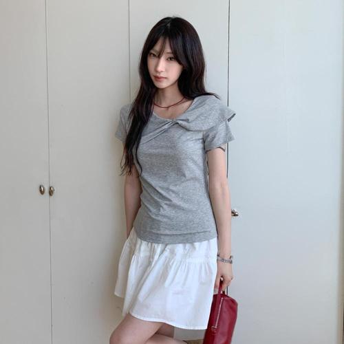 [옷자락] 여자 페미닌 우아한 드레이핑 반팔 티셔츠