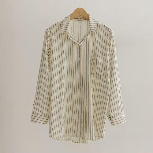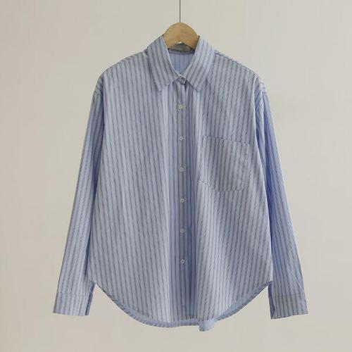 [쉬즈미스]스트라이프 오픈 카라 포켓 셔츠 SWWSTP12100