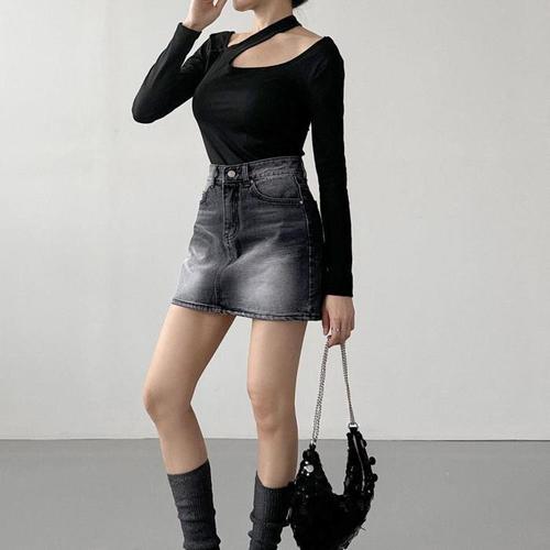 [다잇템]여자 블랙진 일자 짧은 워싱 데님스커트 스커트 (13258520A)