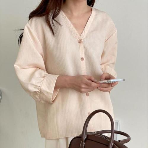 [다잇템]여자 언발 금장단추 세로줄 V넥 남방 칠부 남방 (30464340A)