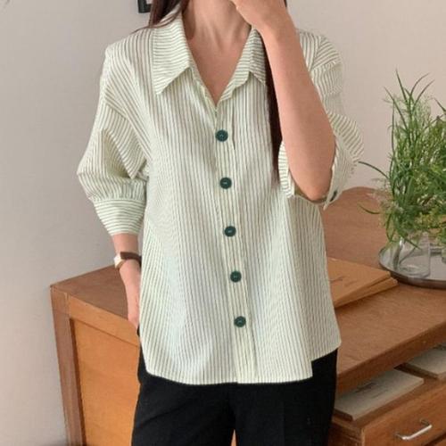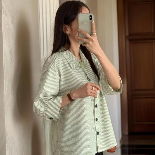 [다잇템]여자 줄남방 반오픈 단가라 칠부소매 셔츠 (11291729A)
