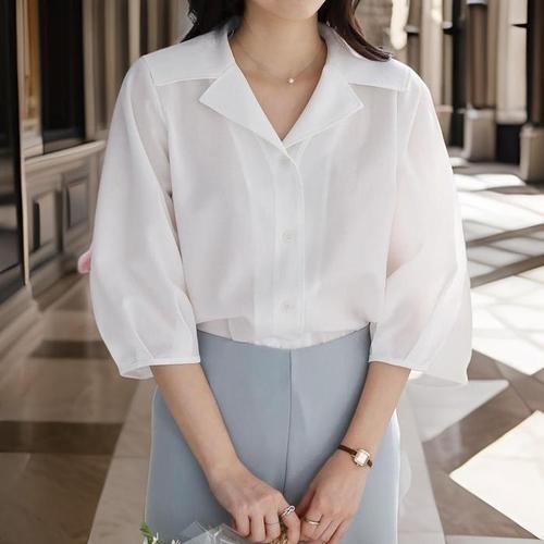 [애비뉴투지]엄마옷 금단추 정장 셔츠 카라 여성 봄 여름 칠부 쉬폰 블라우스 B06216 50대 60대 중년여성