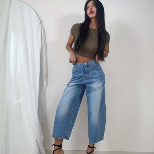 [다잇템]여자 워싱 Y2K 와이드진 9부 라이트블루 청바지 (12846664A)