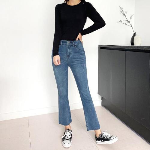 동대문스타일 여성 세미 부츠컷 청바지 빈티지 페이드 워싱 스판 밴딩 8부 9부 데님