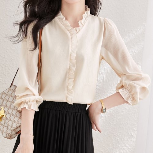 레이스블라우스 트럼펫소매 시스루 상의 댄스복 메쉬 라인