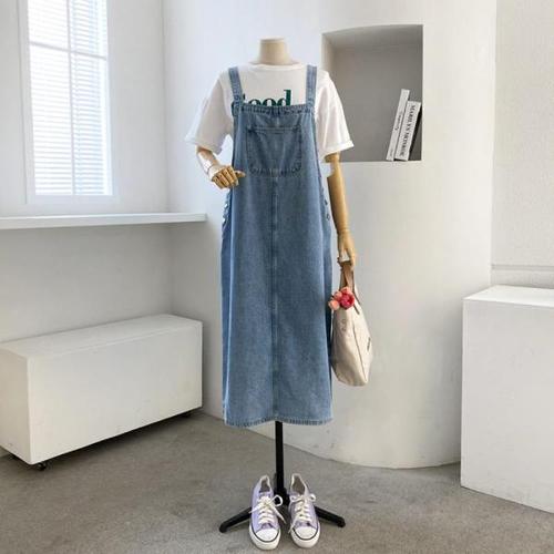 빛나는판다 데님원피스 여성용 봄 여름 루즈핏 레이어드 데님 멜빵 롱 치마 H라인 데님 롱원피스 E88