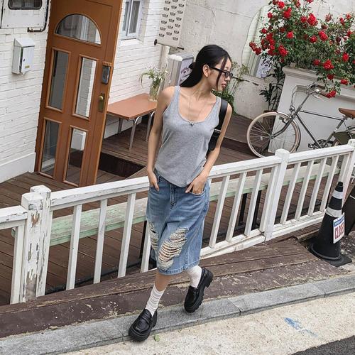 [옷자락] 여자 구제 무릎컷팅 워싱 와이드 찢청 여름 롱 청바지
