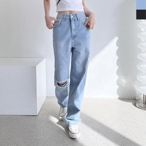 여성 중청 스판 찢청 스트레이트핏 청바지