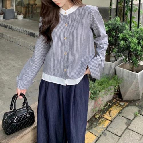 스트라이프 셔츠 블라우스 차이나넥 여자 클래식 배색 (WFKBXAN)
