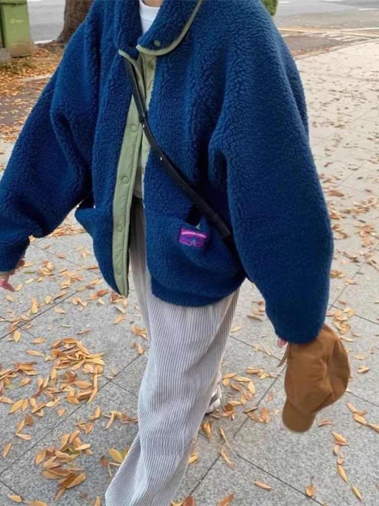 시크한 가을 겨울 빈티지 양면 착용 가능한 루즈핏 다용도 롱 슬리브 양털 재킷 여성 패셔너블한 다용도 아우터웨어