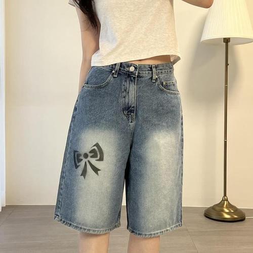 [다잇템]여자 진 나염 버뮤다 리본 투컬러 반바지 (40853971A)