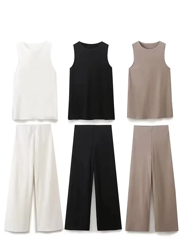 세련된 여성 정장 Y2k 섹시한 두 조각 세트 여름 민소매 슬림 조끼와 넓은 다리 바지 세트 우아한 솔리드 바지 여성 복장